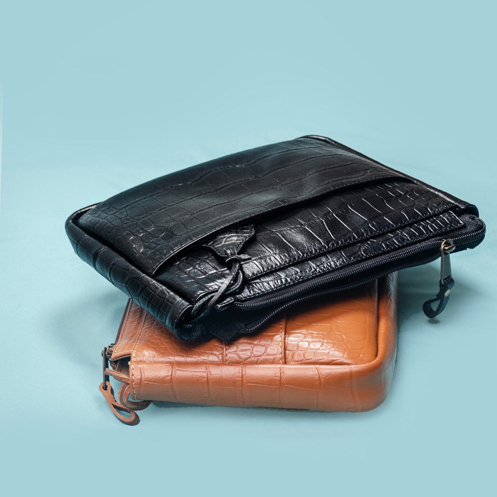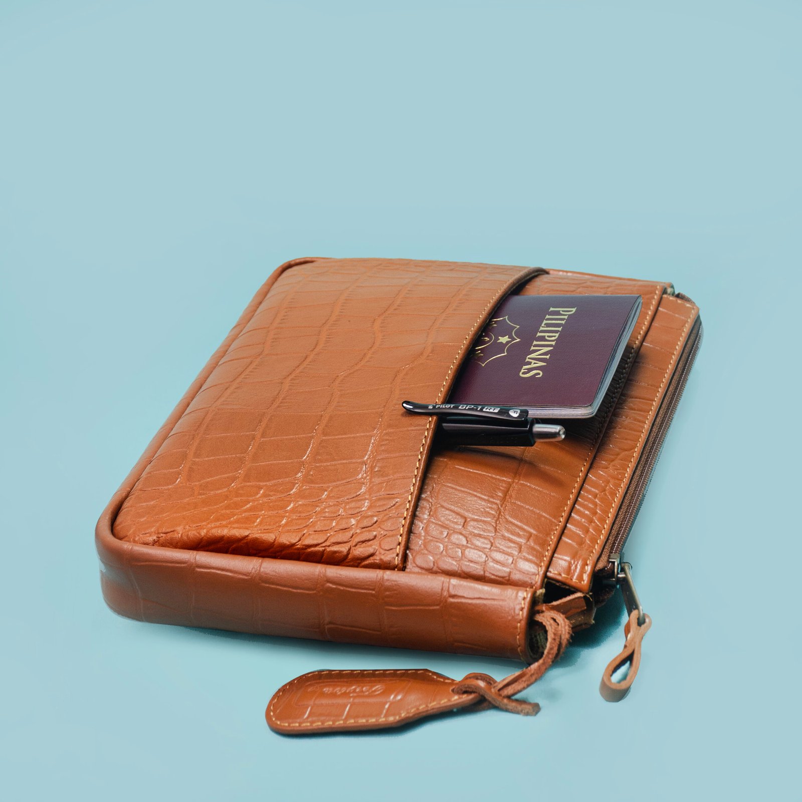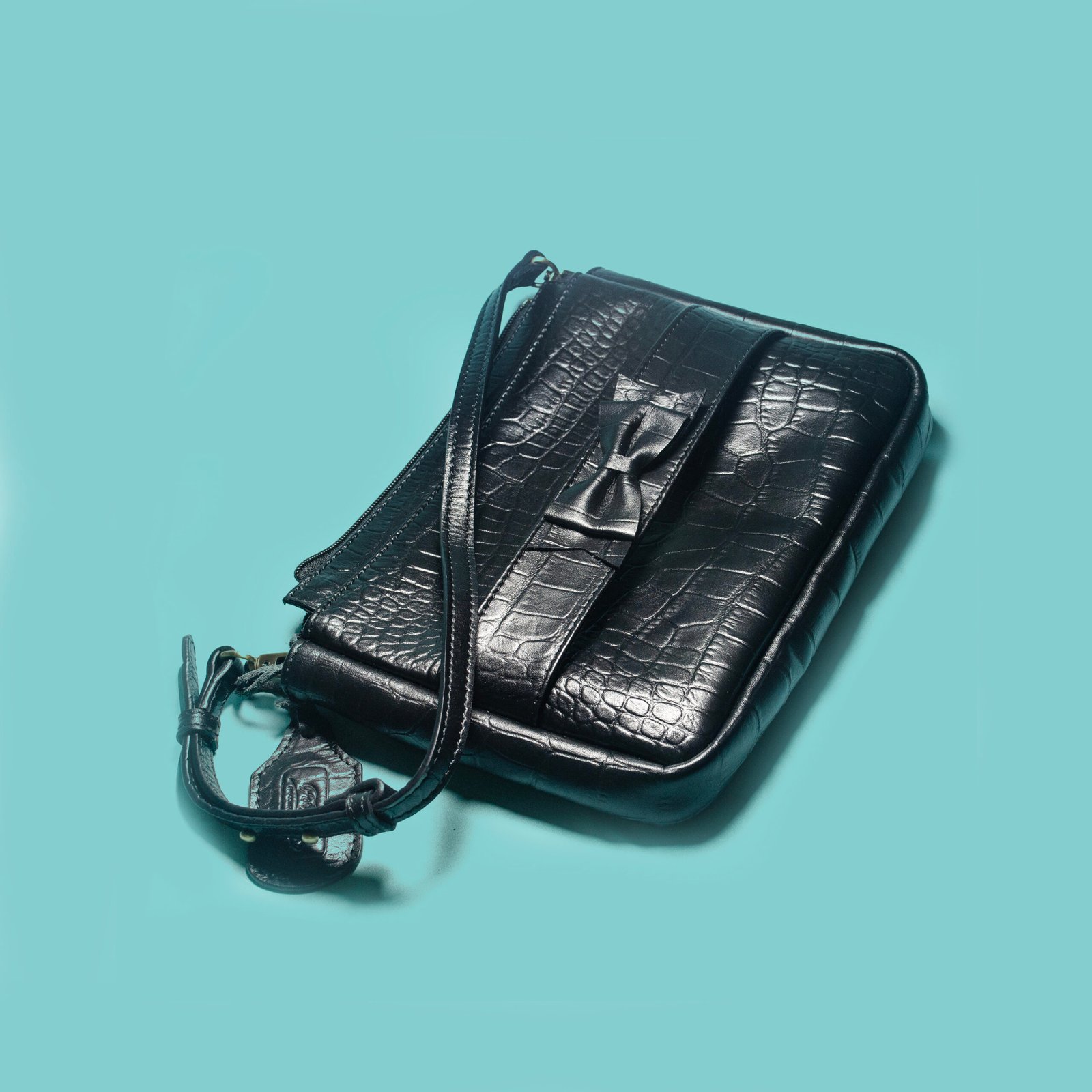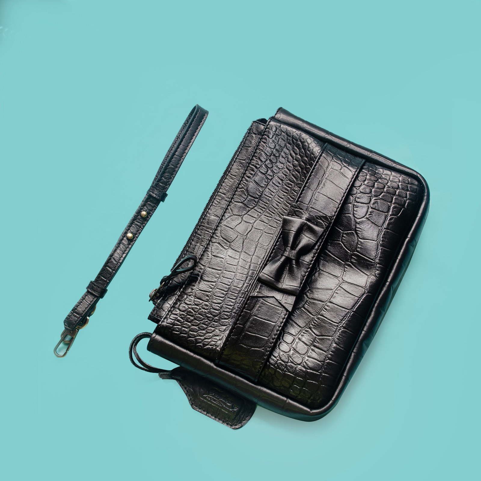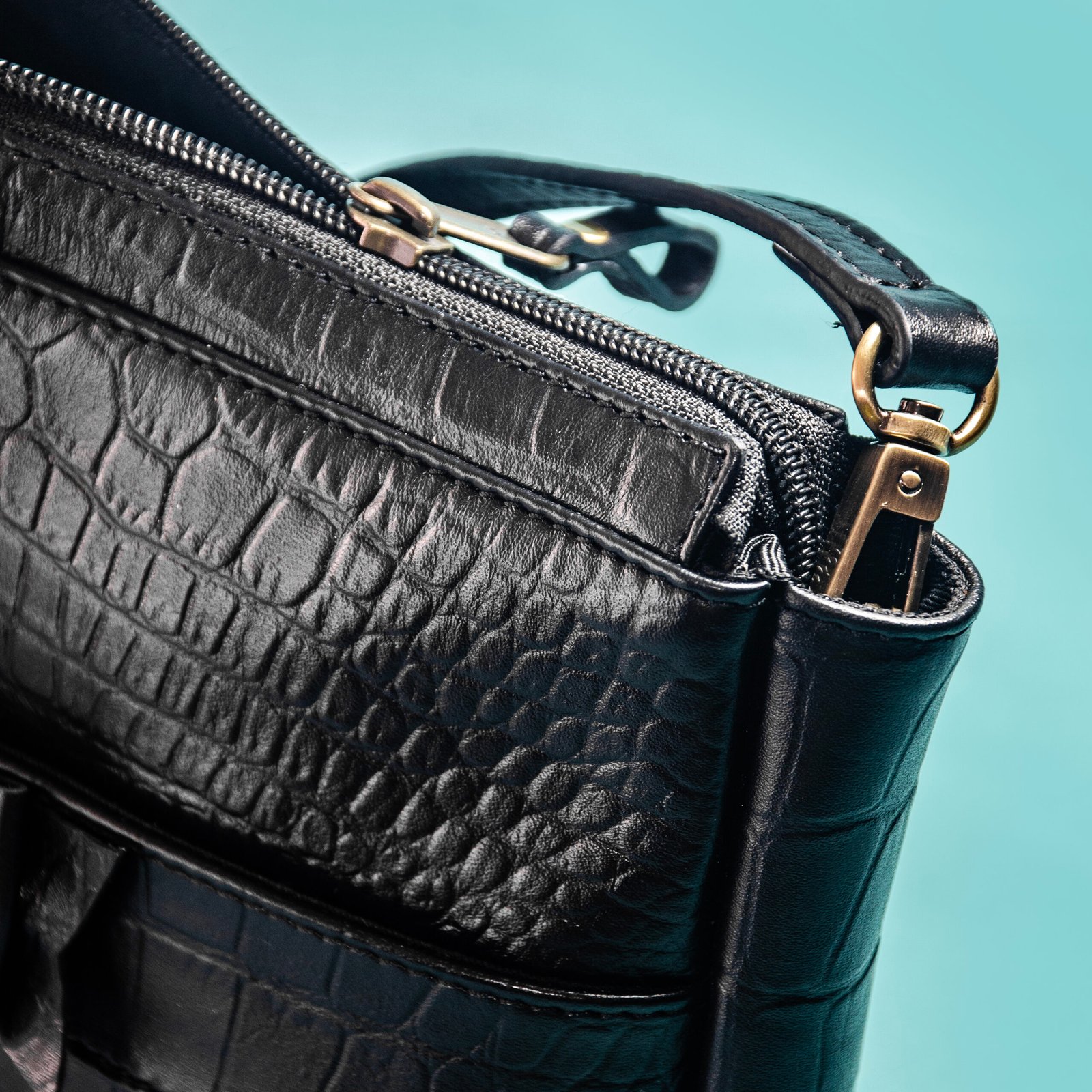 Materials used: Croc-embossed cow leather; cotton twill; nylon zipper and brass metal/hardware